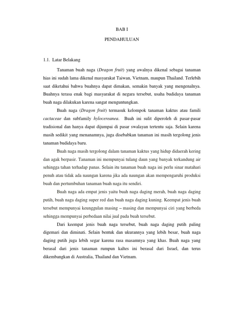 Penelitian dengan judul 1 2. 1 pendahuluan latar belakang buah naga hylocereus sp merupakan salah satu tanaman jenis kaktus yang tergolong baru ditengah masyarakat indonesia dan cukup populer karena rasanya yang manis dan memiliki beragam. Latar belakang tanaman buah naga dragon fruit yang awalnya dikenal sebagai tanaman hias ini sudah lama dikenal masyarakat taiwan vietnam maupun thailand.